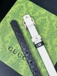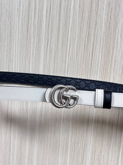 The Fall/Winter 2025 collection reinterprets the distinctive Gg Marmont series. This reversible narrow belt is crafted from Gg-printed embossed leather and other leather materials, adorned with a double-G buckle. Product Details: One side is black Gg-printed embossed leather, the other side is white leather. Light gold hardware. Double-G buckle. Width: 2cm. Black embossed, white base. Hook.