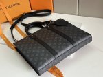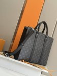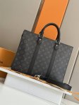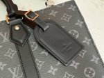This Sac Plat 24H handbag features the elegant style of Monogram Eclipse coated canvas, with side straps, handle fasteners, and a removable name tag for a classic look. It has ample space for a zippered and patch pockets, one of which can accommodate a laptop, and long and short handles for shoulder or hand carry.