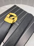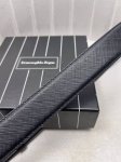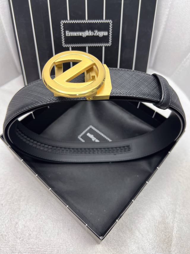 Zegna: Original top-grain cowhide crossgrain top. Lined with top-grain cowhide flat-grain bottom for a woven look. Decorated with the original automatic buckle. Counter width 3.5Jn
