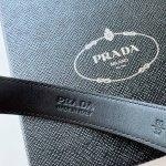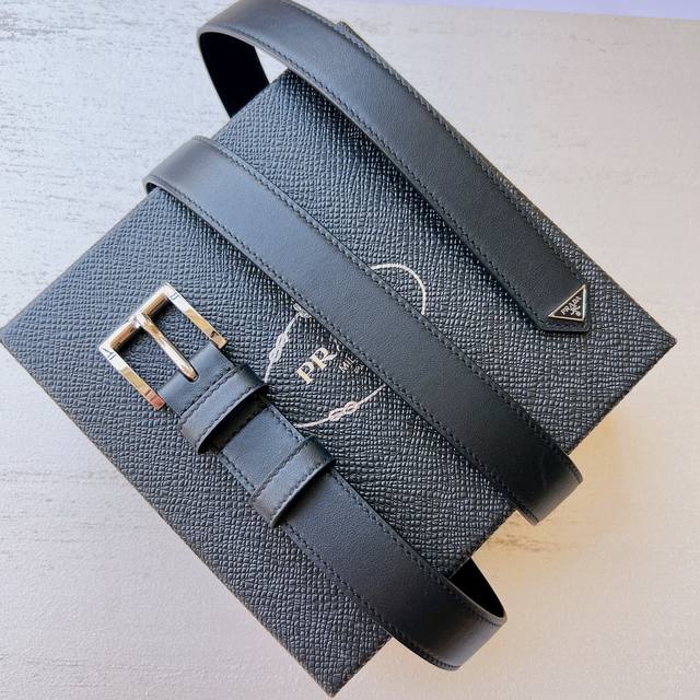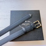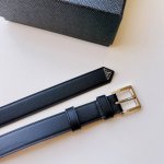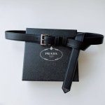 Comes with full gift box. Latest Prada boutique style. This gorgeous leather belt exudes a simple yet sophisticated elegance. The enamel-coated metal triangle logo at the tip showcases a signature element, making it the ideal accessory for Prada's ready-to-wear collection. 2.5cm wide.