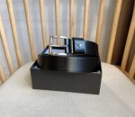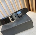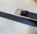 Prada: This latest Prada belt is crafted from exquisite glossy leather, presenting a simple yet sophisticated elegance. The modern, minimalist metal buckle is adorned with an engraved logo, instantly showcasing the brand's style. 3.5cm wide.