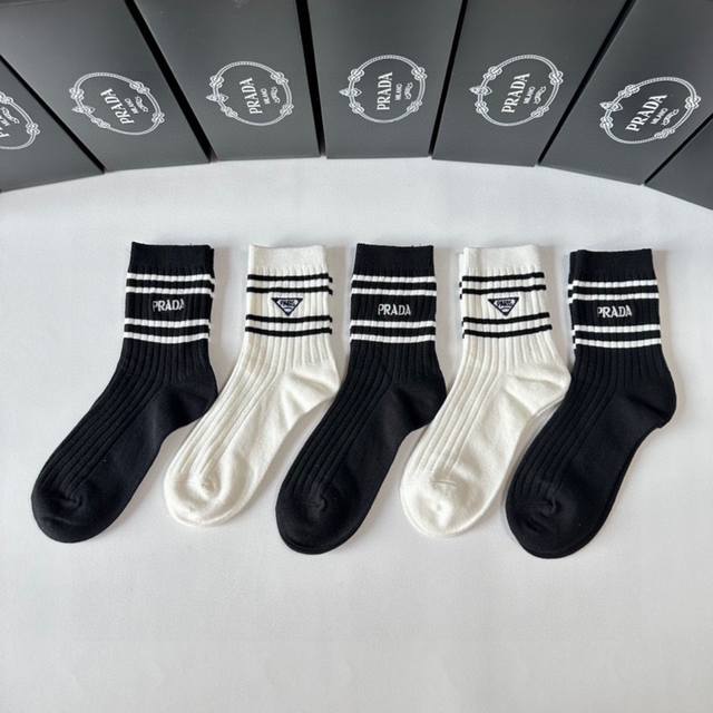 Special Packaging DDD Prada New Embroidered Classic Mid-Length Slouch Socks! Five pairs per box, same style as in department stores, a must-have for trendsetters, super easy to match. DDD