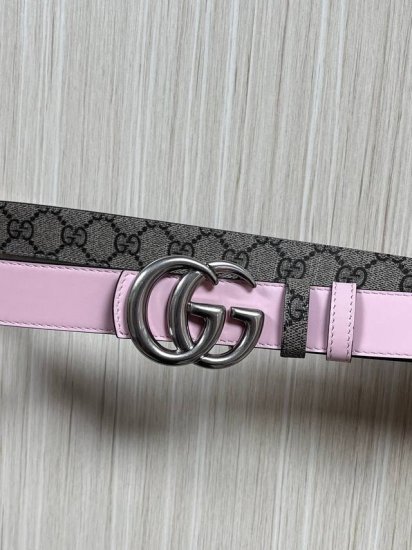 The Fall/Winter 2025 collection reinterprets the distinctive Gg Marmont series. This reversible narrow belt is crafted from Gg-print embossed leather and other leather materials, adorned with a double-G buckle. Product Details: One side is pink Gg-print embossed leather, the other side is apricot leather. Light gold hardware. Double-G buckle. Width: 2cm. Apricot, pink base. Hook.
