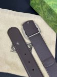 This double-sided belt features red and green webbing and dark brown cowhide leather, with a detachable interlocking double G buckle, adding a new piece to the 2025 Fall/Winter collection. 3.9 wide hem with leather buckle