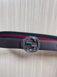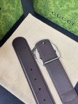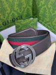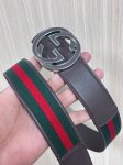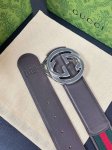 This reversible belt features red and green webbing and dark brown cowhide leather, paired with a detachable interlocking double G buckle, adding a new piece to the Fall/Winter 2025 collection. 4.0mm wide bound leather hook and loop fastener.