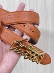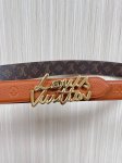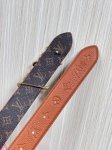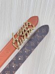 This season's newest belt is crafted from luxurious calfskin and Monogram canvas, allowing for effortless switching between two styles. The Louis Vuitton handwritten logo is transformed into a wide metal buckle, drawing attention to the center and adding an elegant touch to both casual and formal looks. The 3.0 wide wire buckle is made of embossed tan calfskin with a pointed, square design.