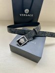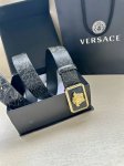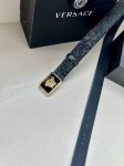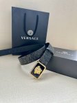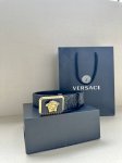 4.0cm wide Versace leather belt with a three-dimensional La Medusa double-sided buckle. One side of the belt is smooth, while the other side is decorated with a checkerboard pattern and Barocco crown pattern.