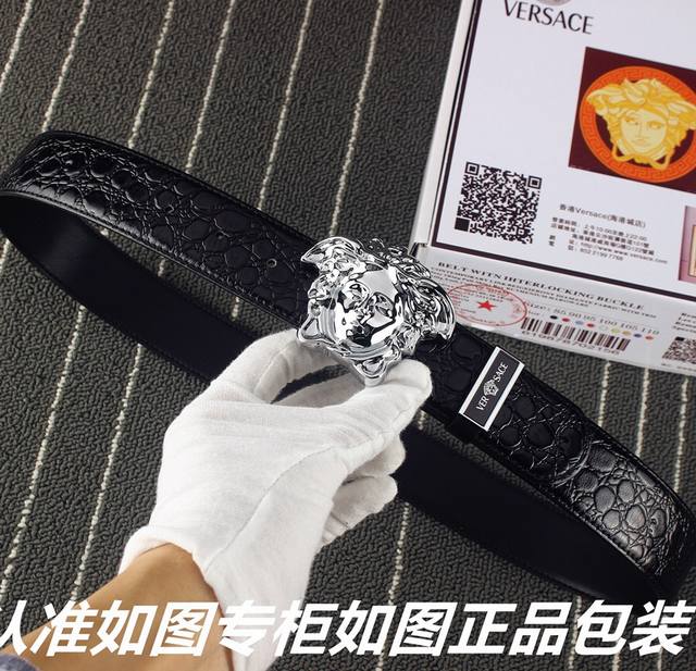 Product Name: Versace Crocodile Pattern Ddd Model: Look for the official packaging shown in the picture. Includes a hole punch. Material: 100% top-grain cowhide leather, guaranteed genuine. Crocodile pattern with a beautiful woman's head design, 24K steel buckle, and diamond-encrusted details. Same quality as official stores. Ideal for gifting or personal use. Packaging: Please look for the official packaging shown in the picture. Invoice included. Width: 3.8mm.