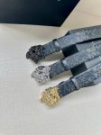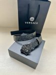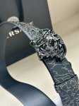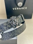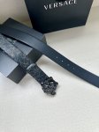 Width 4.0cm Versace leather belt with a three-dimensional La Medusa double-sided buckle. One side of the belt is smooth, while the other side is decorated with a checkerboard pattern and Barocco crown pattern.