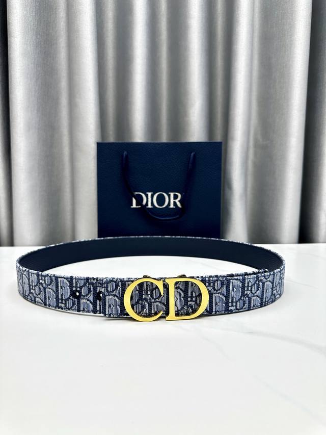 Width 3.5Cm This Dior 35mm reversible belt combines elegance with modern style. The reversible design is crafted from Oblique printed fabric and cowhide leather; one side is blue Oblique printed fabric, and the other is grained cowhide. It can be paired with various 35mm stainless steel belt buckles to create a unique and stylish piece. DDD